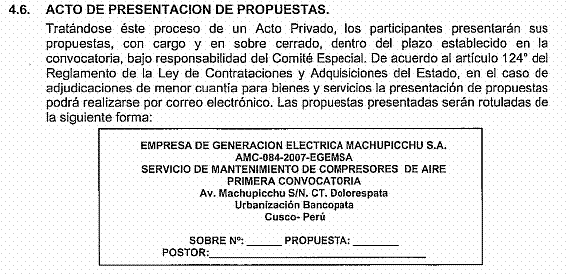 1. Mediante publicación en el Sistema Electrónico de Adquisiciones y Contrataciones del Estado (SEACE) de fecha 19 de junio de 2007, la Empresa de Generación Eléctrica Machupicchu S.A. (EGEMSA), en adelante La Entidad, convocó la Adjudicación de Menor Cuantía AMC-084-2007-EGEMSA (Primera Convocatoria), para la contratación del servicio de mantenimiento de compresores de aire, por un valor referencial total ascendente a S/. 11 990.35 nuevos soles.